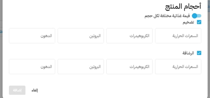 • أحجام المنتجات: تستخدم هذه الخاصية لربط المنتج بالقيم الغذائية حسب حجم الباقة (مثل: إنقاص وزن، تضخيم…)، بحيث تظهر للعميل القيم المناسبة لنفس المنتج تلقائيًا حسب الباقة المختارة, او اضافة قيم غذائية ثابتة بغض النظر عن الحجم.